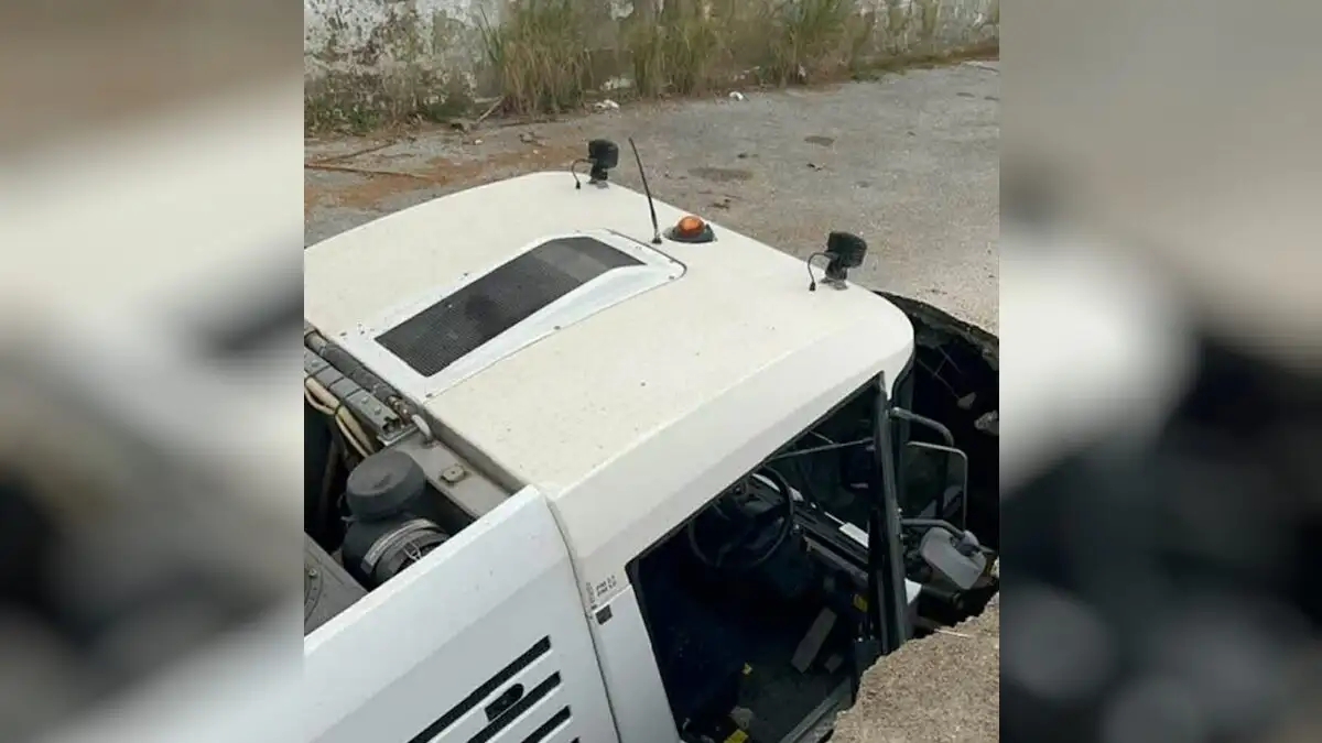Όπως φαίνεται, άνοιξε ξαφνικά ένας μεγάλος κρατήρας στο δρόμο και το μηχάνημα καθαριότητας έπεσε μέσα σε αυτόν. Ευτυχώς δεν τραυματίστηκε ο οδηγός.