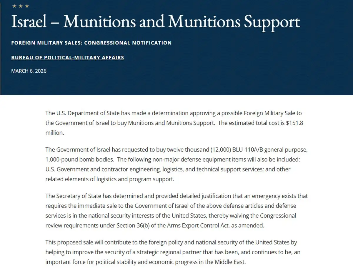 Ο υπουργός Εξωτερικών των ΗΠΑ Μάρκο Ρούμπιο χαρακτήρισε τον πόλεμο με το Ιράν ως «κατάσταση έκτακτης ανάγκης», επιτρέποντας στην κυβέρνηση να προχωρήσει άμεσα στην πώληση, παρακάμπτοντας τη διαδικασία κοινοβουλευτικού ελέγχου που προβλέπει η αμερικανική νομοθεσία για εξαγωγές όπλων.