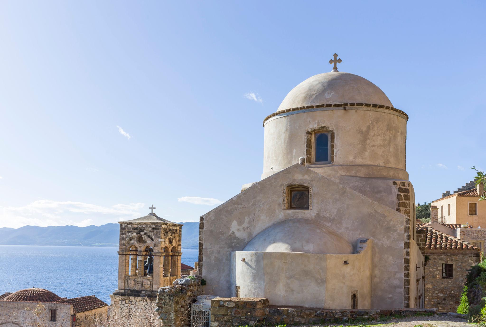 Στην Άνω Πόλη, με φόντο το απέραντο γαλάζιο, δεσπόζει η επιβλητική Αγία Σοφία Μονεμβασιάς, χαρίζοντας μια από τις πιο καθηλωτικές εικόνες του ελληνικού τοπίου. Από εδώ, η θέα προς το Μυρτώο πέλαγος μοιάζει ατελείωτη.