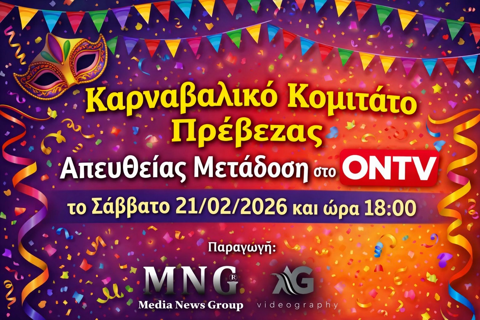 Παρακολουθήστε σήμερα (Σάββατο 21 Φεβρουαρίου 2026) από τον παρακάτω player την μεγάλη με άρματα παρέλαση του Καρναβαλικού Κομιτάτου Πρέβεζας 2026, σε ζωντανή σύνδεση από την Λ. Ειρήνης, μέσω της συχνότητας του On TV!!