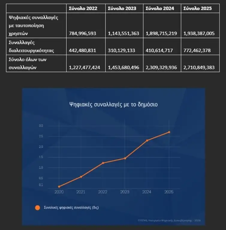 Οι ψηφιακές συναλλαγές πολιτών με το Δημόσιο κατέγραψαν το 2025 σημαντική αύξηση, φτάνοντας τα 2,710,849,383 γεγονότα – άνοδος 86% σε σχέση με το 2023 και 17% σε σχέση με το 2024.