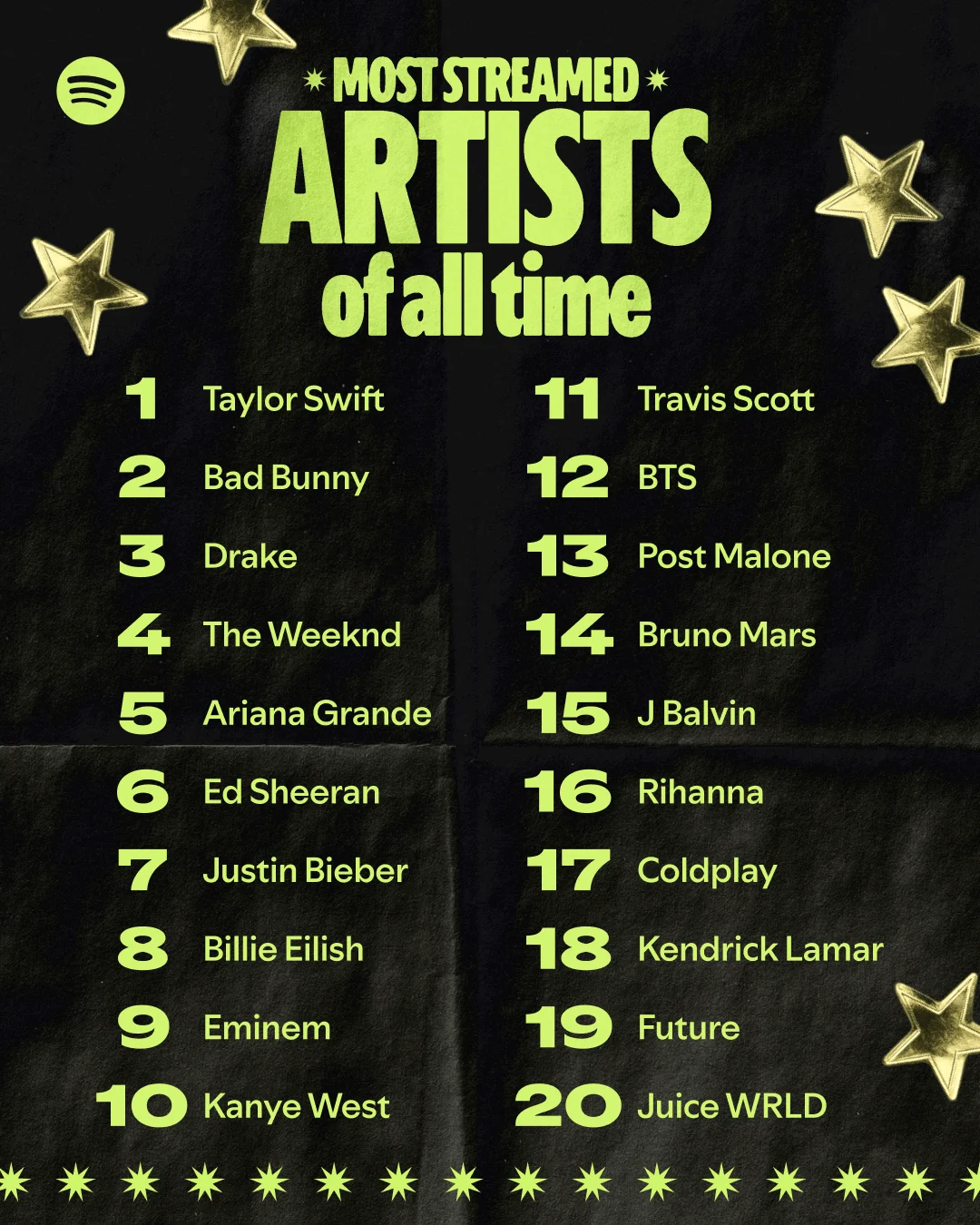Στη δεύτερη θέση της λίστας των καλλιτεχνών που έχουν συγκεντρώσει τα περισσότερα streams βρίσκεται ο Bad Bunny, ο οποίος το 2025 είχε αναδειχθεί ο πιο δημοφιλής καλλιτέχνης της χρονιάς, εκτοπίζοντας τη Swift. Οι δύο καλλιτέχνες εναλλάσσονται τα τελευταία χρόνια στην κορυφή των streaming charts.